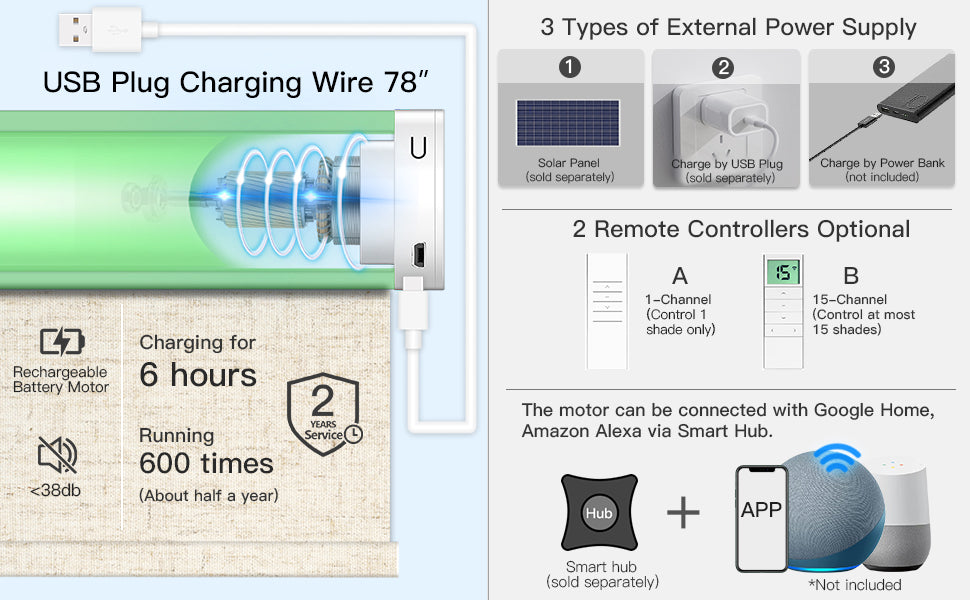 The motor is powered by a built-in rechargeable battery that lasts for months on a single charge. When paired with a solar panel, charging concerns are eliminated. An RF hub/bridge is required for connection to Alexa, Google Assistant, and other smart home systems. Two remote control options are available: