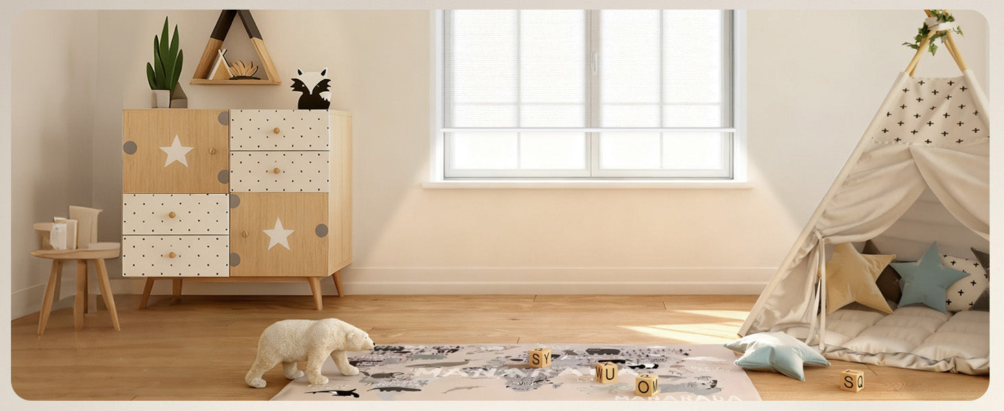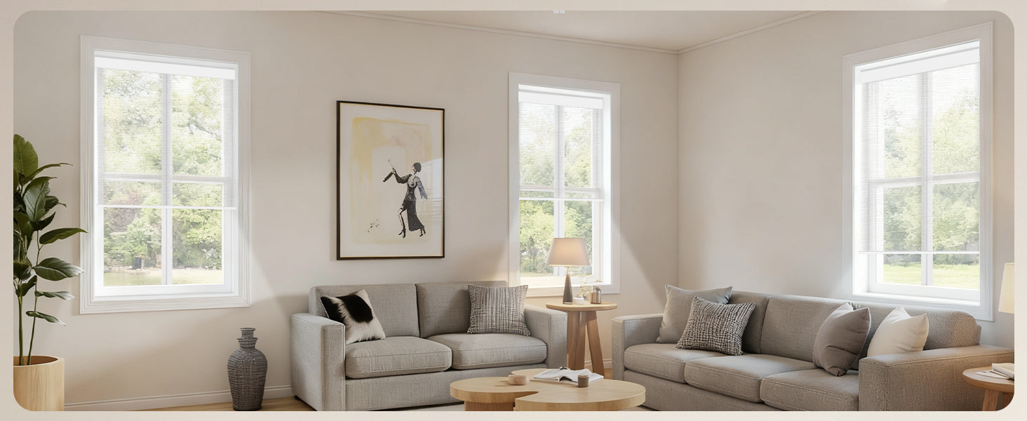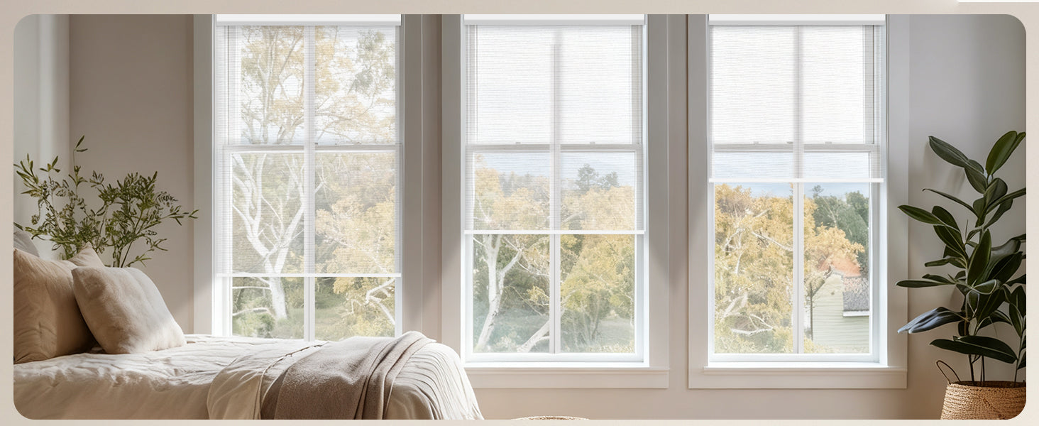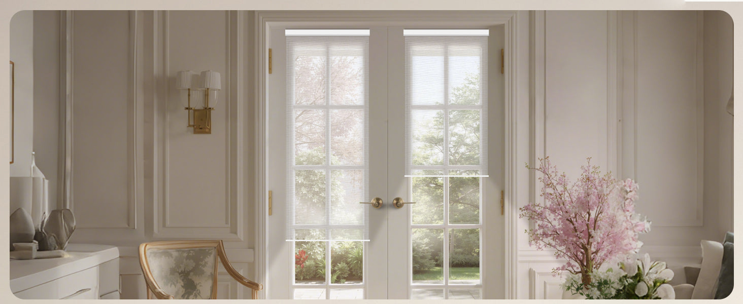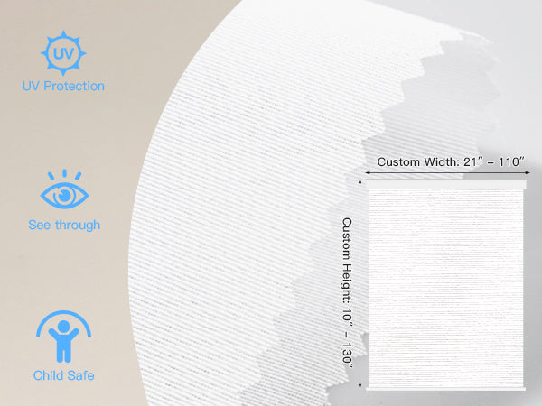 Made from 40%-60% blackout polyester fabric, this material protects from UV rays while allowing natural light to filter through. It offers excellent privacy by blocking visibility from the outside. The cordless design ensures a child- and pet-safe environment. Perfect for living rooms, patio sliding doors, kitchens, offices, and more. For indoor use only.