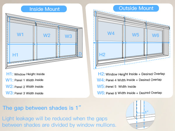 - Outside Mount: Provide the full measurements (left to right, top to bottom) of the area you want to cover. Height includes the valance/cassette. For minimal light leakage, we recommend adding 6" to both width and height.