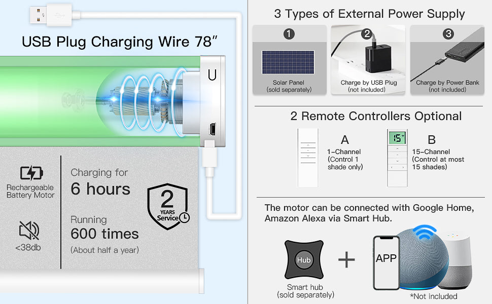 モーターは出荷前に十分にプログラムされています。設置後はリモコンで直接操作できます。AlexaおよびGoogle Assistantに接続するには、RFハブが必要です。窓が高い場合やコンセントから遠い場合は、ソーラーパネルを追加することで充電の問題を解決できます。ソーラーパネル1枚でスマートブラインド1台のみ動作します。