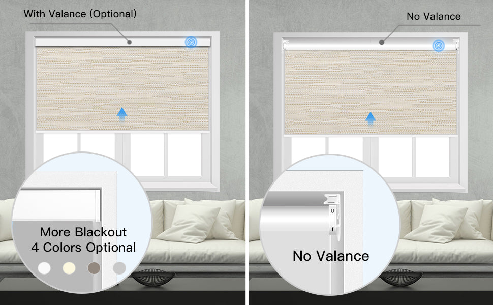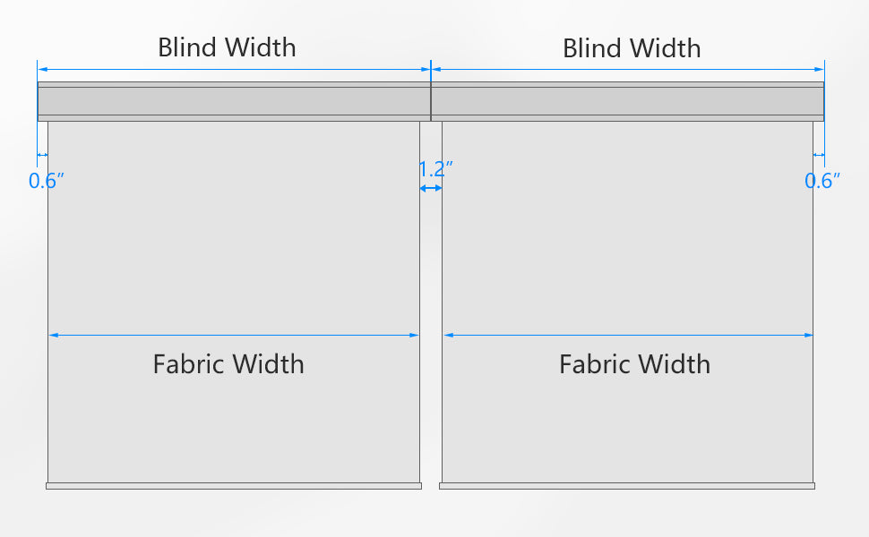 リモコンブラインドの構造上、生地の幅はローラーシェードの幅より1.2インチ短くなります。ブラインドを2枚ずつ取り付ける場合、2つのバランス/ブラケット間に隙間がなくても、生地間に約1.2インチの隙間が残ります。